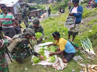 Komandan Satgas Yonif 323 Kostrad, Letkol Inf Tri Wiratno, telah menekankan kepada para Prajurit TNI bahwa kegiatan membantu kesulitan masyarakat di daerah tugas merupakan hal yang perlu dilakukan saat melaksanakan tugas pokok pengamanan wilayah. Oleh karenanya, hari Rabu tersebut, para Prajurit TNI memanfaatkan waktu pengamanan Pos dengan membantu perekonomian warga yang berjualan hasil tani.